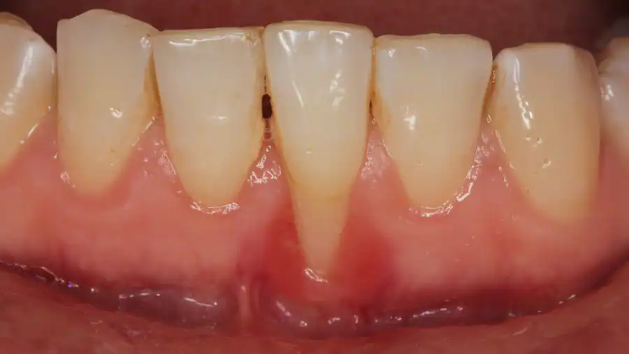 Dấu hiệu nhận biết viêm cận răng đó là thường bị mảng vụn thức ăn tích tụ nhiều tại các khoảng trống giữa lợi và răng.